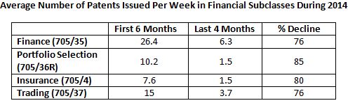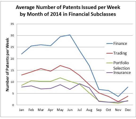 For the first half of 2014, the Patent Office issued patents related to financial services at historically high rates. Then Alice happened. The last quarter of 2014 saw a significant decline in granted patents for financial services. The numbers are striking.