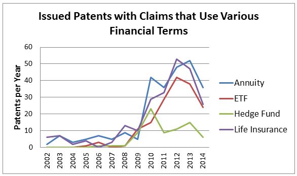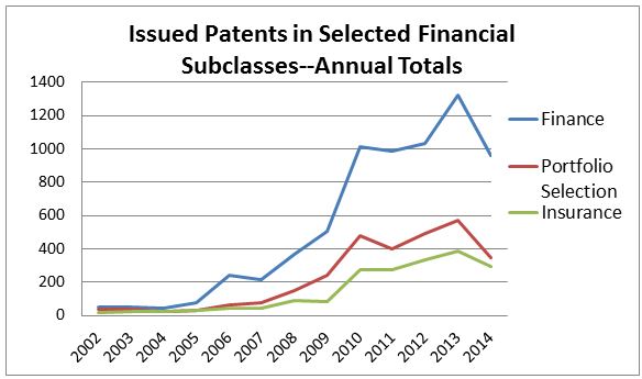 For the sake of completeness, I’ve also attached a few additional charts illustrating the overall trends for financial services patents over the last several years. All of the data used to create these have been collected using the freepatentsonline.com website.