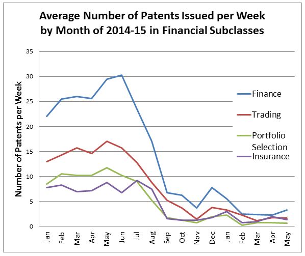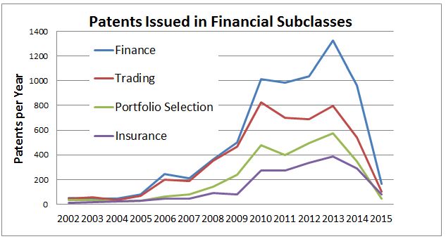 On an annualized basis, the grant rates have retreated to about where they were in the 2005-08 period. The graph below illustrates the annual grant rate in the financial subclasses since 2002, with 2015 pro-rated based on the first 20 weeks of the year.